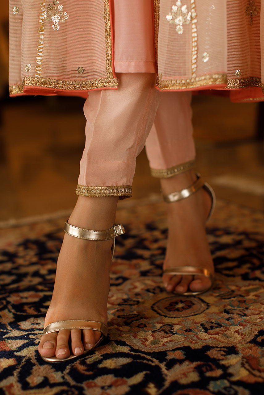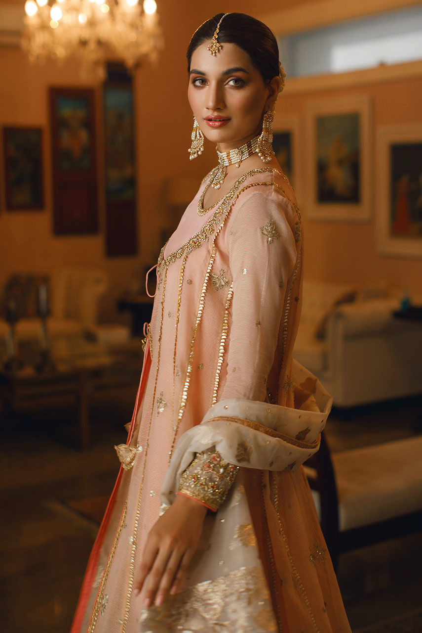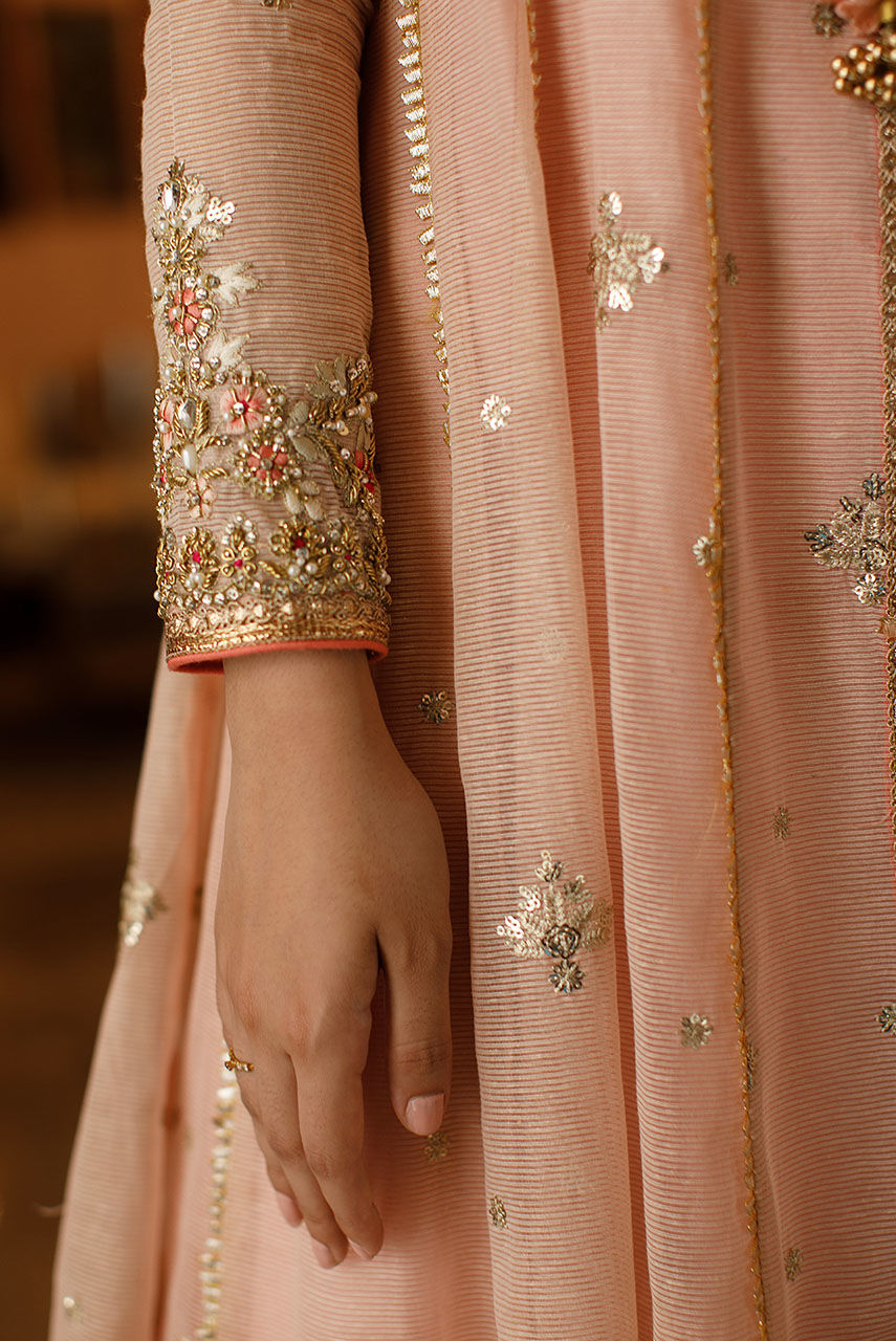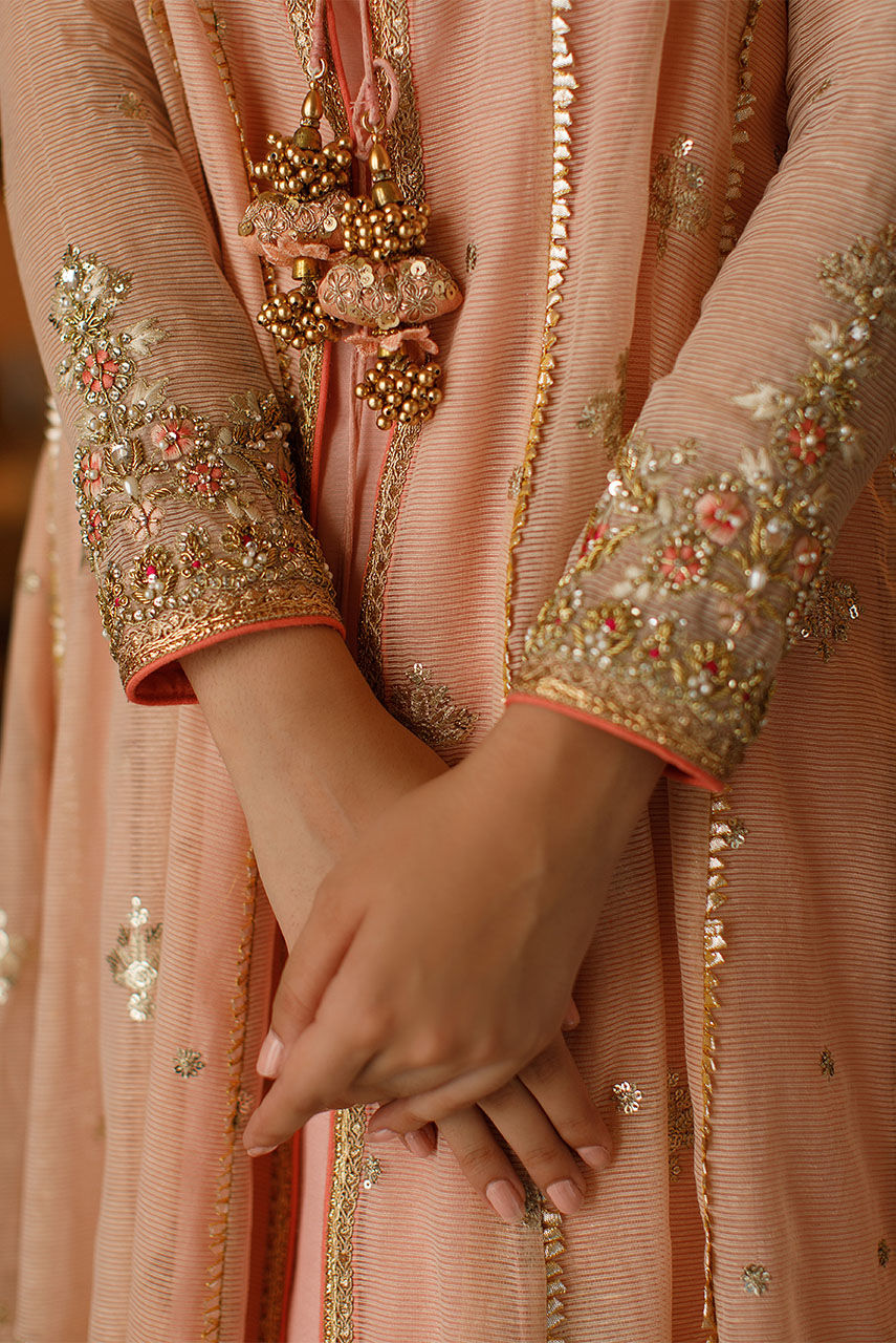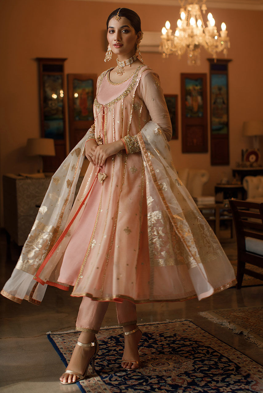 A pink peach double layered kalidar in delicate ornate Resham, zardozi and crystal embroidery finished with hand crafted tassels. It is paired with an organza badla boti dupatta and silk trousers finished with lace.