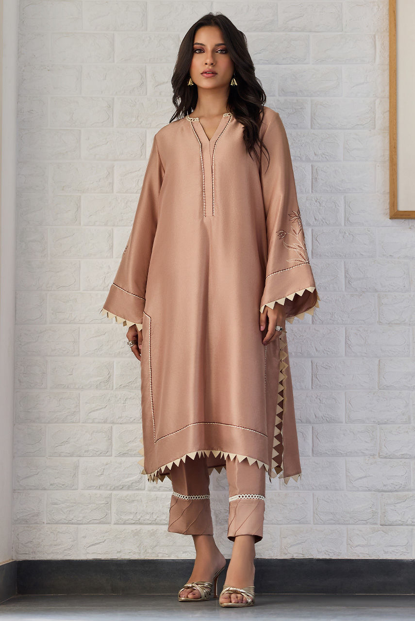 Crafted in rich coffee raw silk, this ensemble features understated embroidery and intricate stitching details, complemented by a brown printed dupatta.