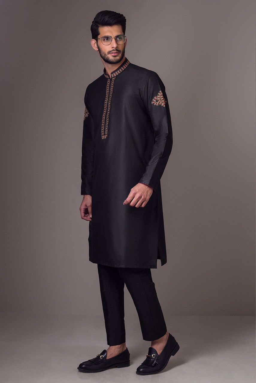 Black cotton silk kurta pajama with embroidery on collar, placket and arms