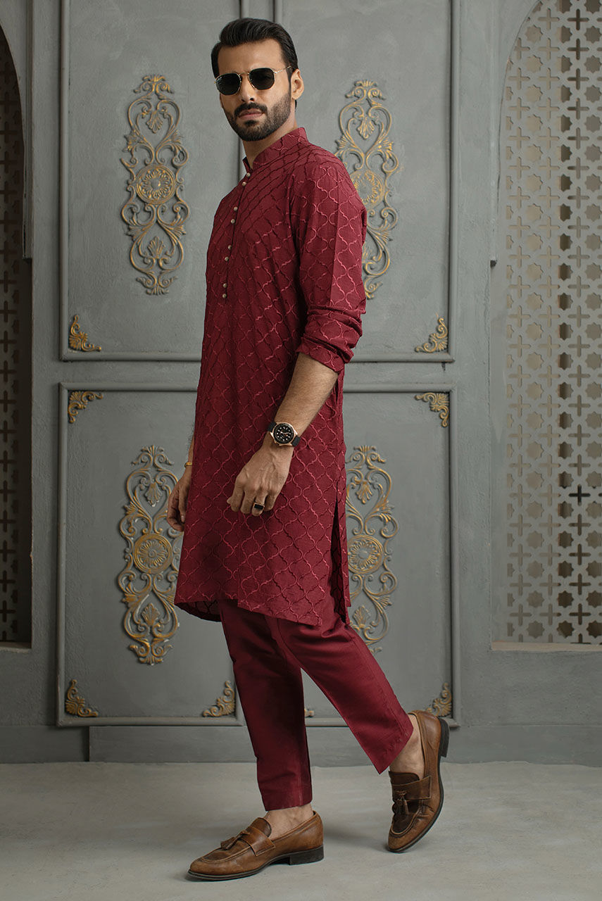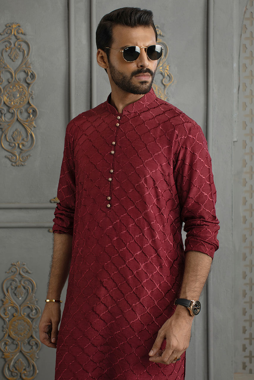 Color: Maroon Fabric: Raw Silk Work Details: Embroidered