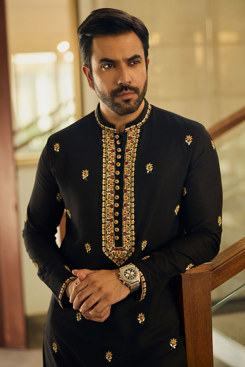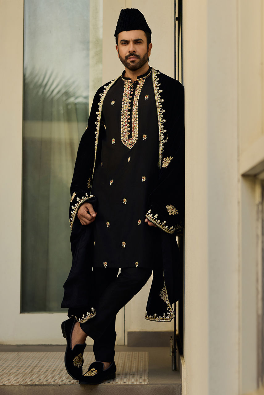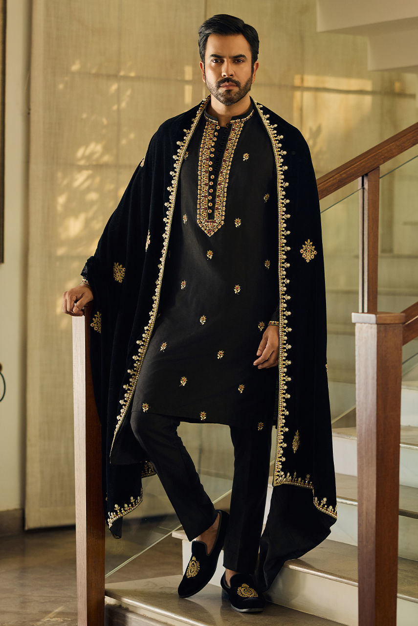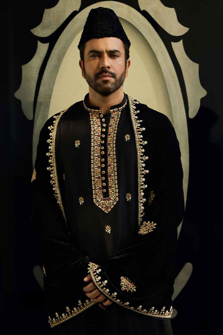A commanding silhouette in timeless black, elevated by masterful traditional embroidery. This Kurta features a fine, crisp black fabric with a striking, heavy Zari-work design focused around the high band collar and placket. The gold and bronze metallic threadwork creates an intricate, dense ceremonial pattern, while scattered smaller motifs adorn the sleeves and lower hem. Paired with perfectly tailored black traditional pajama, this ensemble is the epitome of sophisticated evening wear, ideal for formal family occasions, Eid celebrations, or upscale festive events. The Obsidian Velvet Shawl. Draped in Drama. Elevate your formal wear with the ultimate winter accessory. Our plush velvet shawl, framed by breathtaking metallic hand-embroidery. Warmth meets royalty.