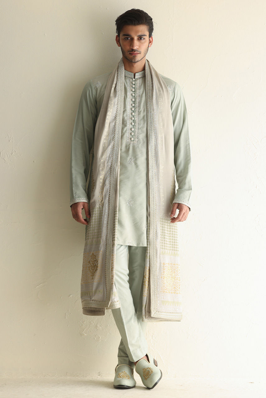 Khaddi silk kurta pajama embellished with all-over motifs and delicate handwork on the collar and placket, refined fusion of heritage and craftsmanship.