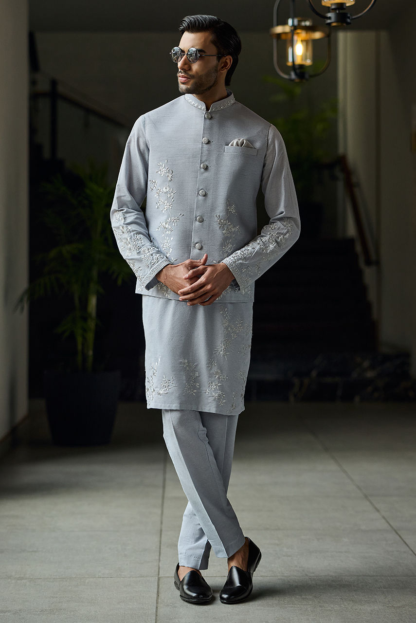 An embroidered raw silk waist coat paired with a khaddi silk kurta pajama.