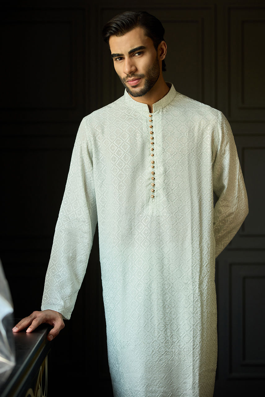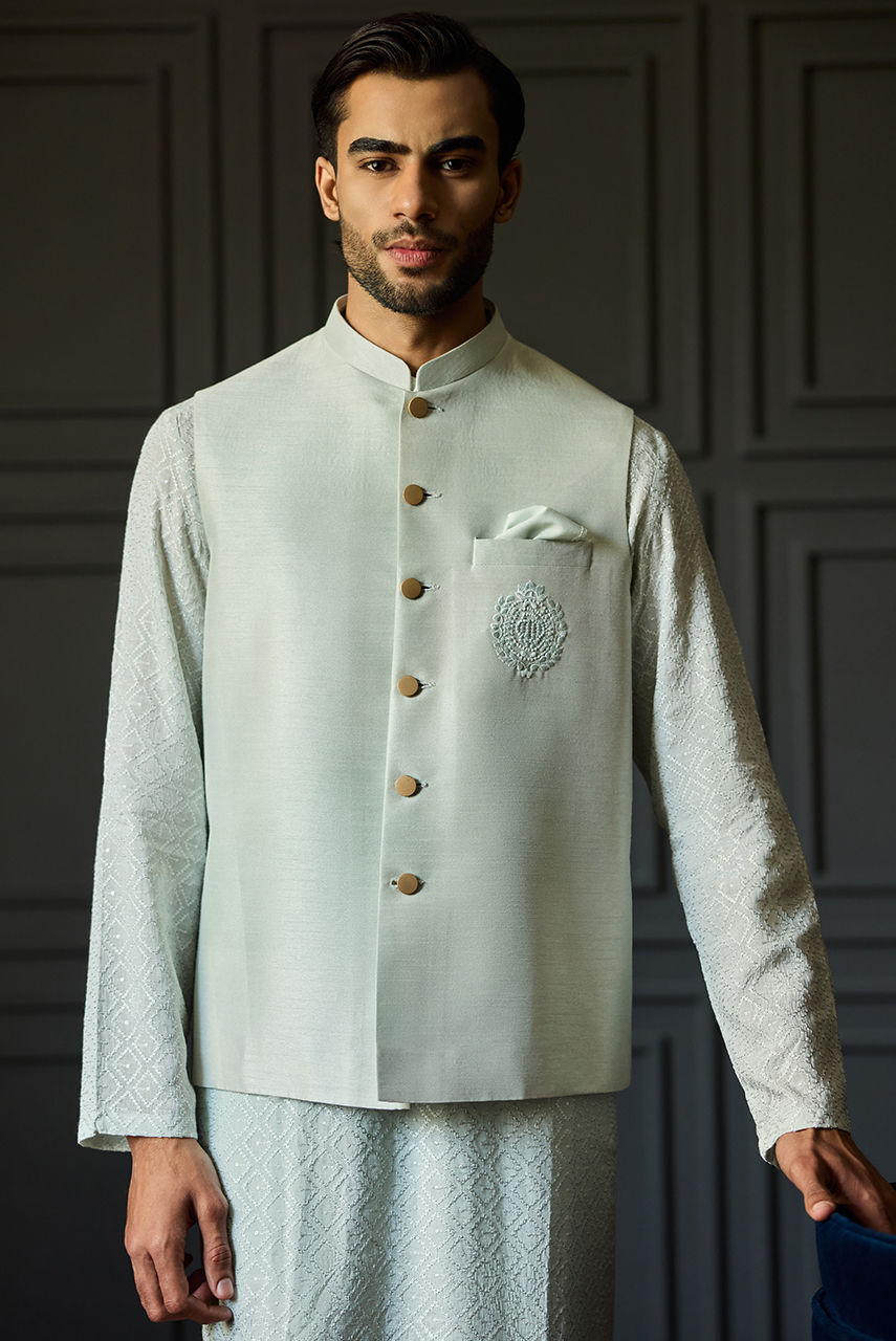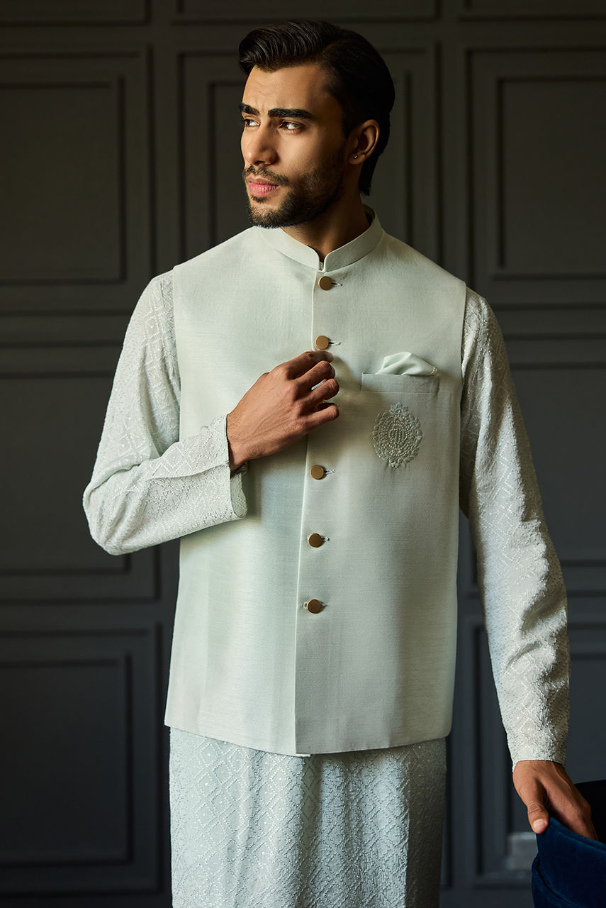 The Signature Mint Chikan Ensemble Define your festive wardrobe with this understated yet luxurious Mint ensemble. The centerpiece is a meticulously crafted Kurta Shalwar in intricate Chikan fabric, offering a textured, airy feel perfect for the season. It is paired with a premium Raw Silk waistcoat that adds a layer of smooth structure and sheen. The look is finished with the signature Deepak Perwani logo embroidered on the chest pocket, serving as a mark of authentic designer craftsmanship.