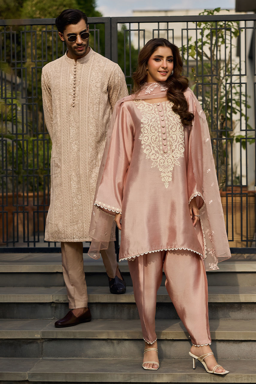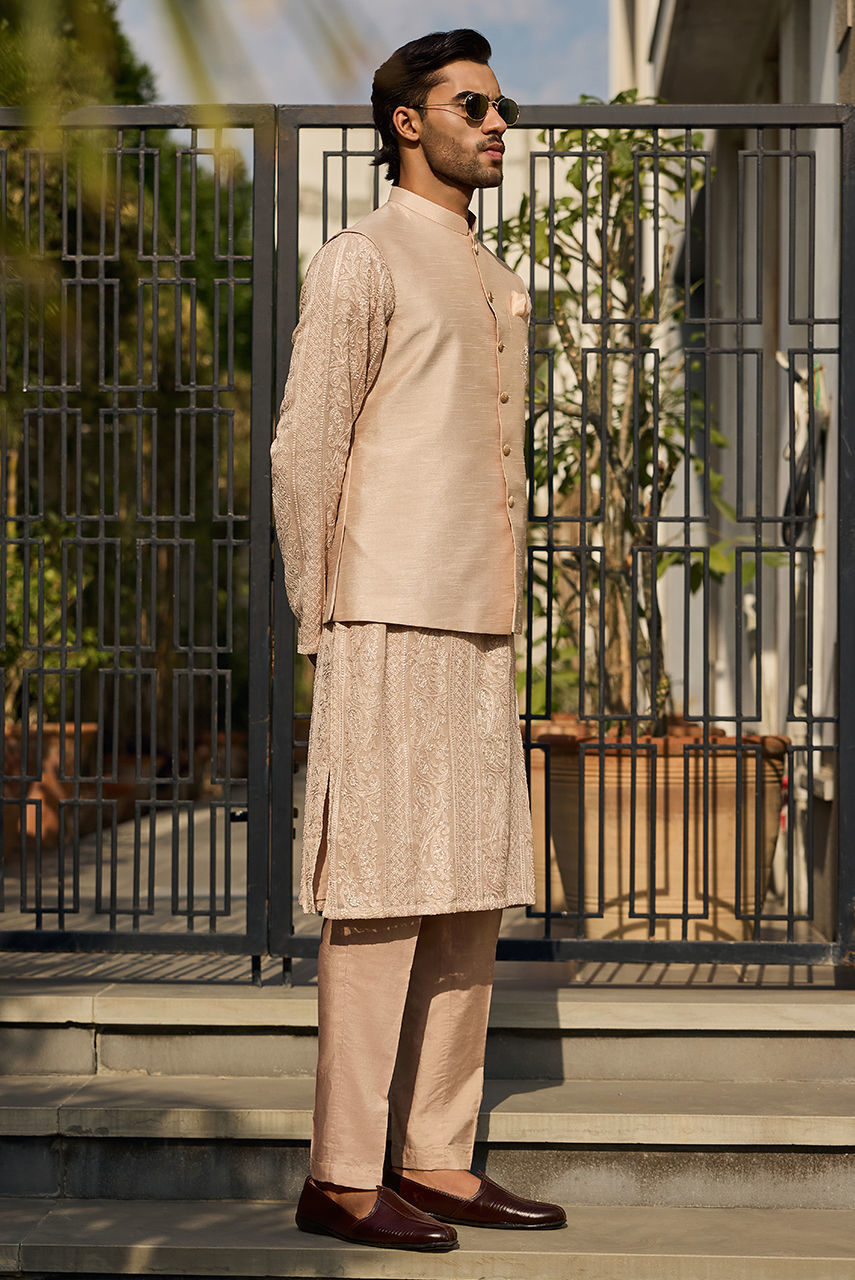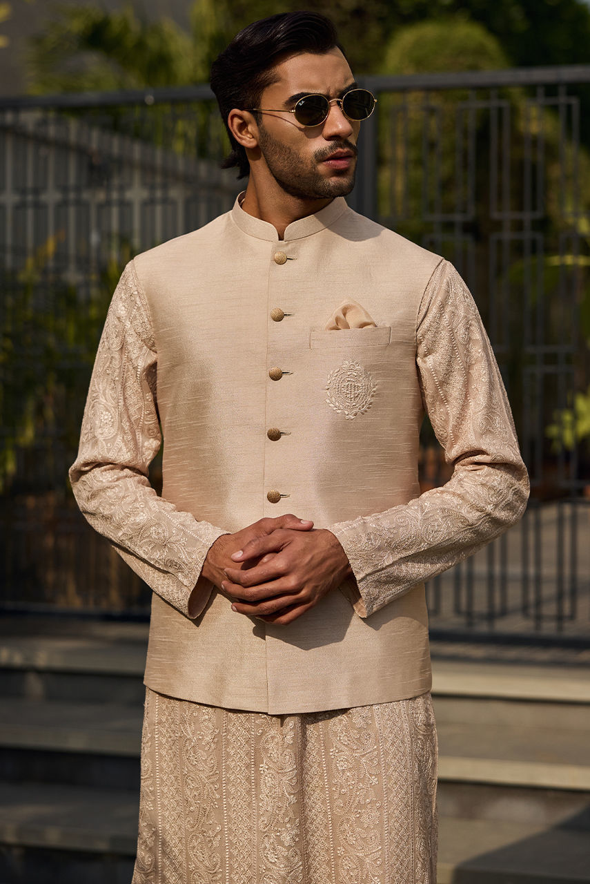 The Signature coffee Chikan Ensemble Define your festive wardrobe with this understated yet luxurious coffee ensemble. The centerpiece is a meticulously crafted Kurta Shalwar in intricate Chikan fabric, offering a textured, airy feel perfect for the season. It is paired with a premium Raw Silk waistcoat that adds a layer of smooth structure and sheen. The look is finished with the signature Deepak Perwani logo embroidered on the chest pocket, serving as a mark of authentic designer craftsmanship.