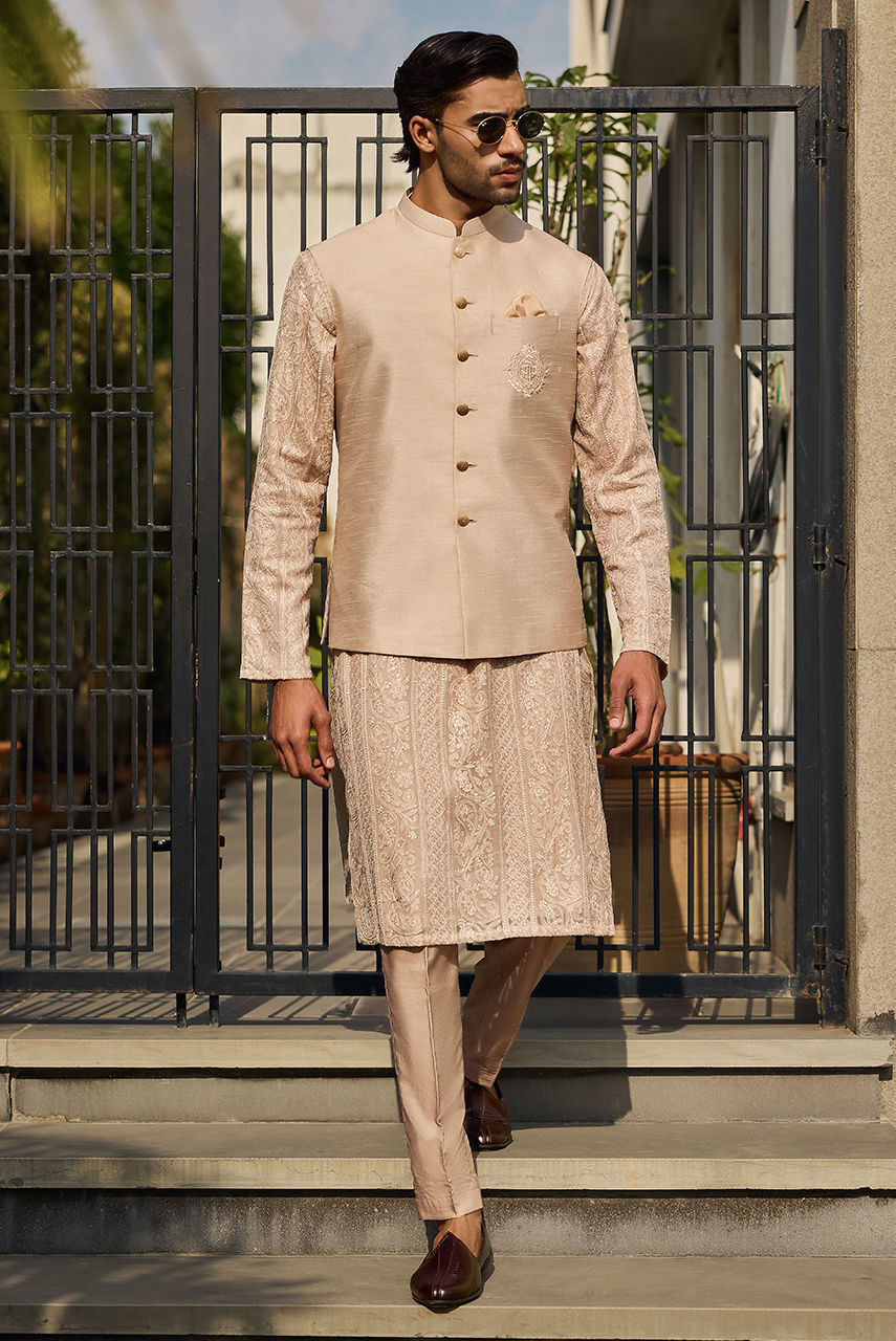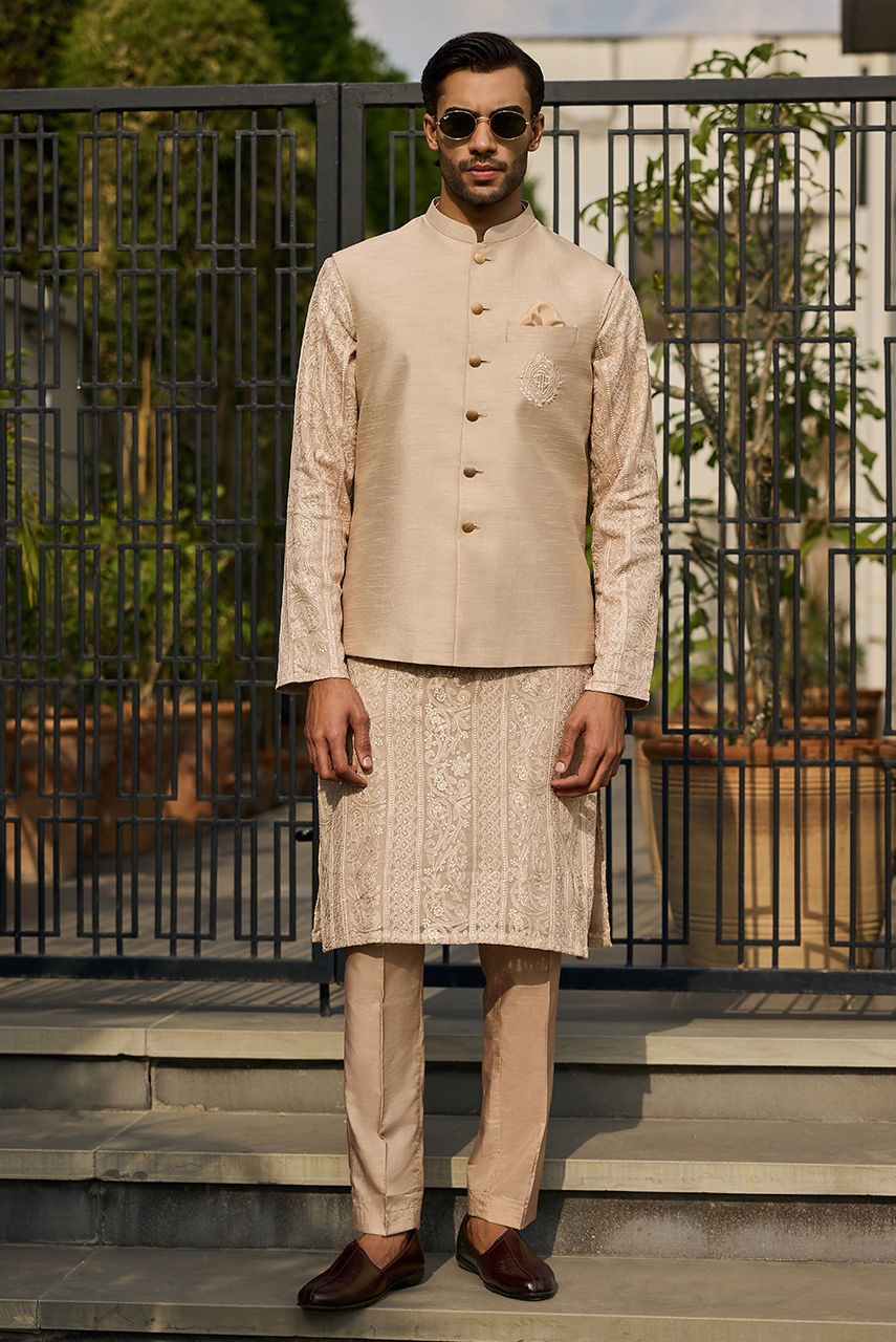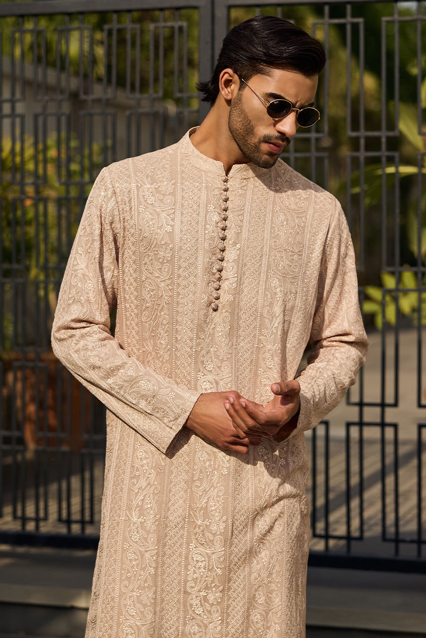 The Signature coffee Chikan Ensemble Define your festive wardrobe with this understated yet luxurious coffee ensemble. The centerpiece is a meticulously crafted Kurta Shalwar in intricate Chikan fabric, offering a textured, airy feel perfect for the season. It is paired with a premium Raw Silk waistcoat that adds a layer of smooth structure and sheen. The look is finished with the signature Deepak Perwani logo embroidered on the chest pocket, serving as a mark of authentic designer craftsmanship.