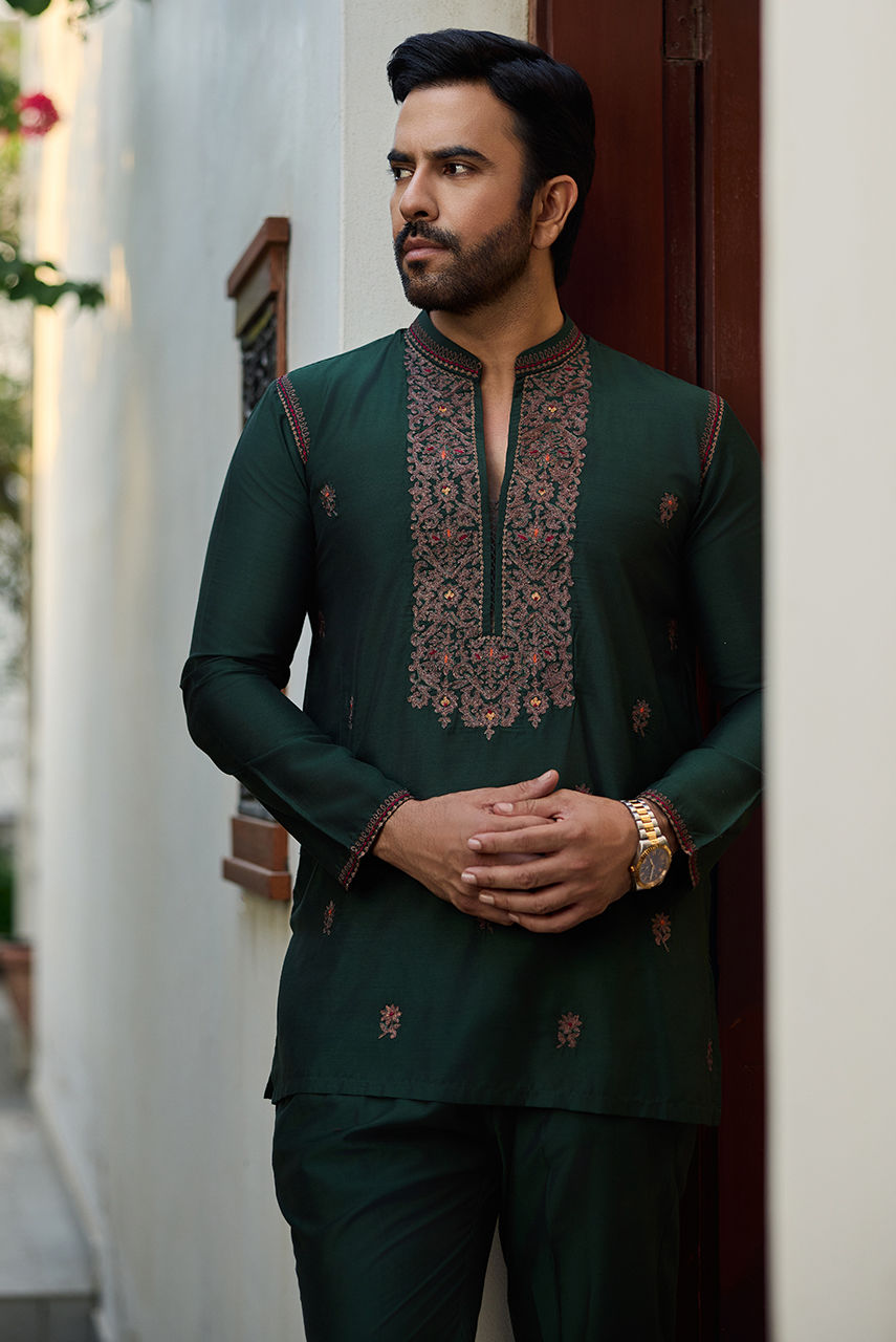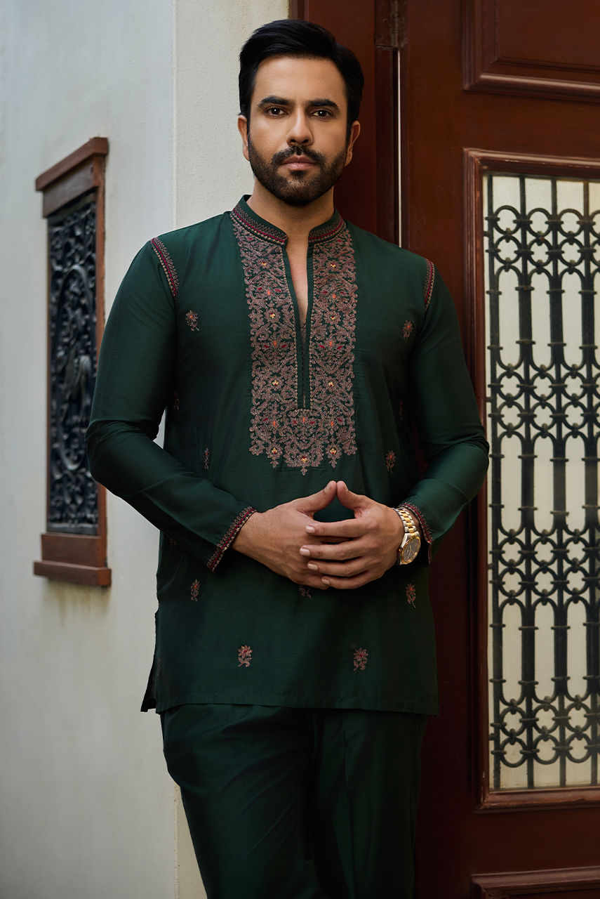Make a grand statement in this breathtaking Emerald Green Kurta Pajama ensemble. Crafted from rich Cotton Silk, the fabric boasts a stunning saturation that catches the light beautifully. The tailored kurta features a structured Band collar and placket, adorned with fine, contrasting embroidery typically in antique gold, tone-on-tone Resham work, meticulously placed to frame the neckline and cuffs. Paired with coordinating emerald green pajamas, this ensemble is the quintessential choice for a high-end Eid look, a Mehndi ceremony, or any festive evening where traditional elegance is paramount.