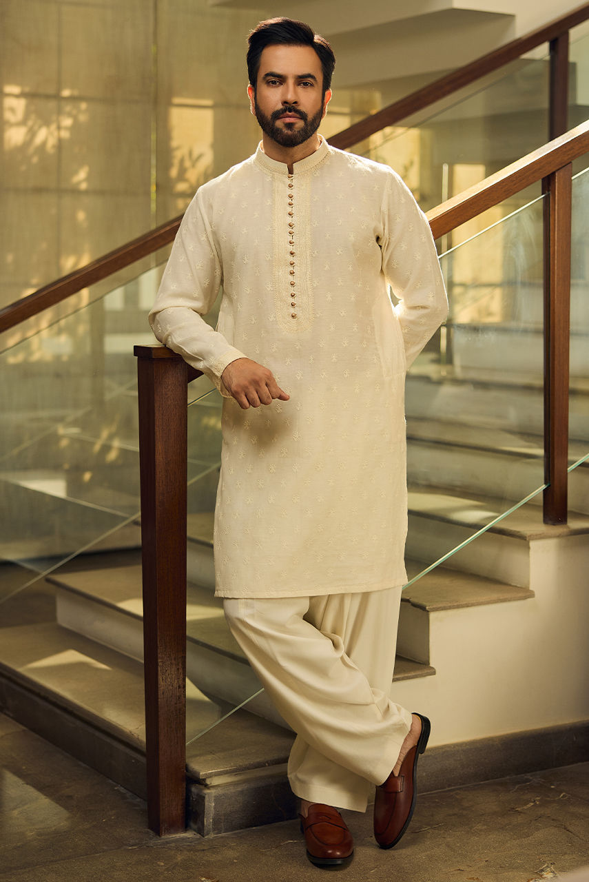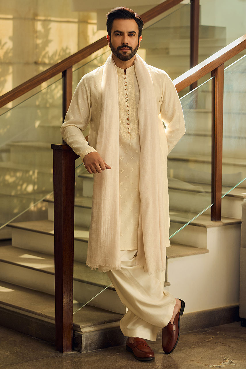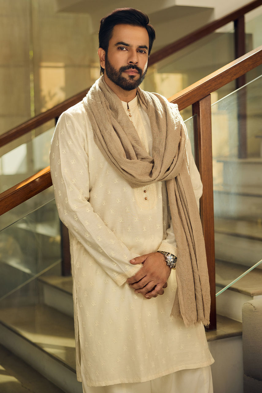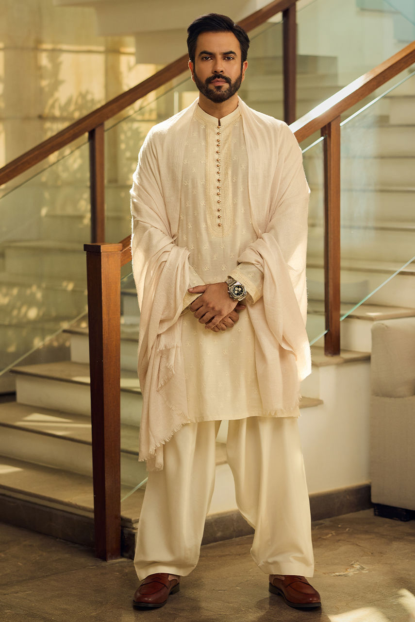 This ensemble features a meticulously tailored kurta crafted from a fine, self-textured cotton or silk blend, adorned with delicate, tone-on-tone small motif embroidery throughout. The look is dramatically completed by a finely woven Pashmina Shawl in a complementary soft Taupe color. The gentle drape and contrasting color of the shawl instantly elevate the pristine ivory, making this ensemble suitable for festive winter occasions, formal daytime gatherings, or celebratory prayers like Eid.