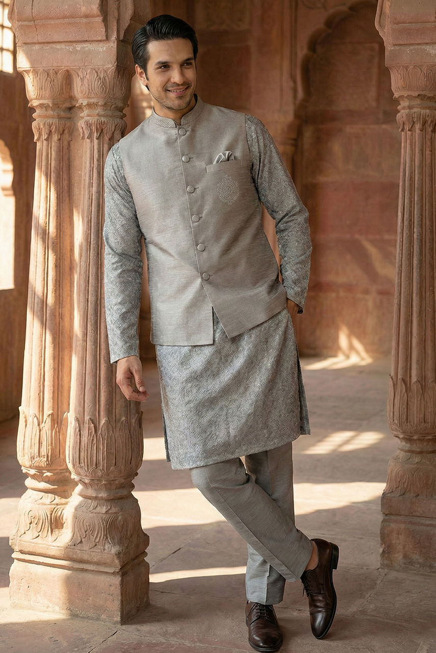 The Signature Grey Chikan Ensemble Define your festive wardrobe with this understated yet luxurious grey ensemble. The centerpiece is a meticulously crafted Kurta Shalwar in intricate Chikan fabric, offering a textured, airy feel perfect for the season. It is paired with a premium Raw Silk waistcoat that adds a layer of smooth structure and sheen. The look is finished with the signature Deepak Perwani logo embroidered on the chest pocket, serving as a mark of authentic designer craftsmanship.