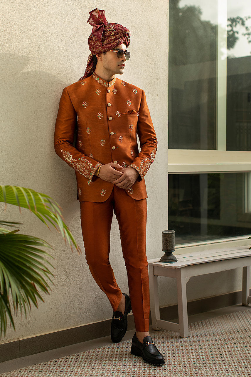A squash burnt orange raw silk prince coat and trousers with intricately detailed hand embroidery on the coat and hand worked buttons. Complemented with a maroon organza turban with hand printed pattern and can be customized in any color.