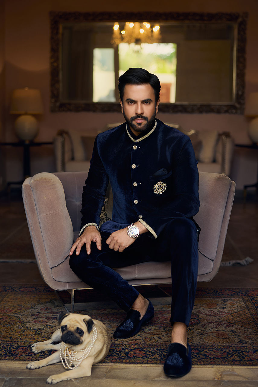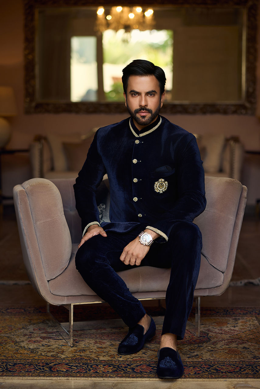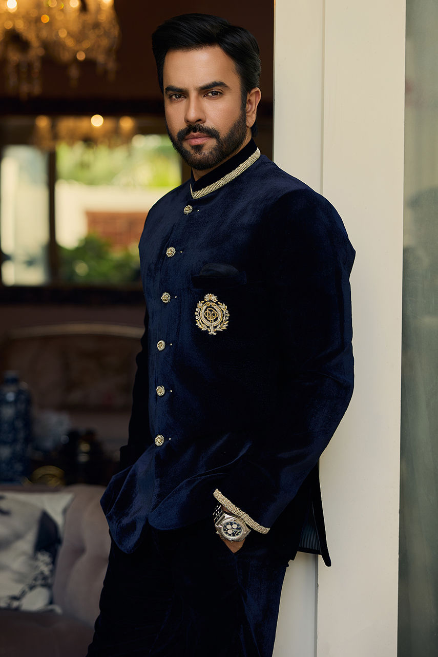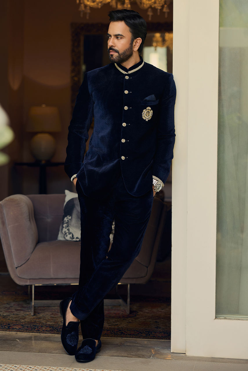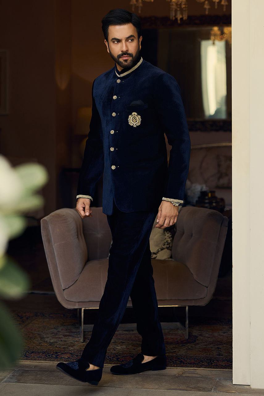 A breathtaking Midnight Navy Velvet Bandhgala Suit, a modern interpretation of traditional royalty. The jacket is impeccably tailored in plush velvet, featuring a standing Mandarin collar (Bandh) highlighted with delicate gold hand embroidery. The front is adorned with large, polished metallic buttons, leading down to a tailored fit. A striking embroidered DP crest on the chest pocket adds a touch of aristocratic heritage. Paired with matching slim-fit velvet trousers and embroidered velvet shoes, this ensemble is the quintessential choice for a groom, a close family member at a wedding, or an elite formal celebration.