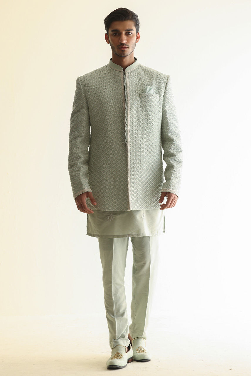 Fully embroidered raw silk front-open jacket paired with a khaddi silk kurta featuring hand-embroidered collar, placket, and all-over motifs for a rich, handcrafted look