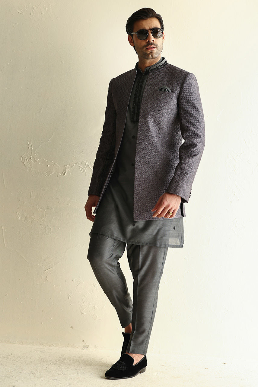 Fully embroidered raw silk front-open jacket paired with a khaddi silk kurta featuring hand-embroidered collar, placket, and all-over motifs for a rich, handcrafted look