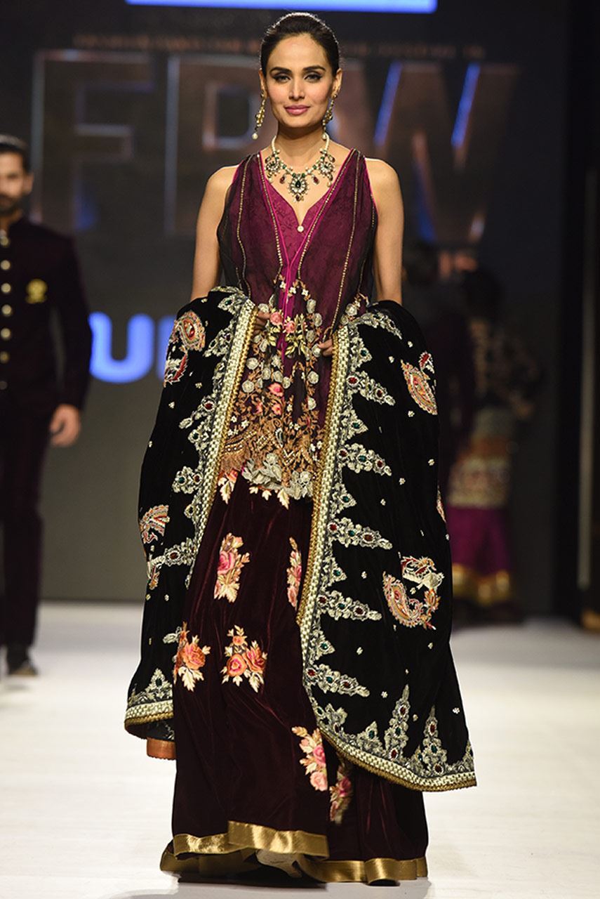Black organza cape with heavy embroidery at the bottom done in resham, diamante, pearls and sequins, plum lace inner paired with an opulent velvet skirt with heavily embroidered flowers. A rich velvet shawl with extensive embroidery is added to finish the look.