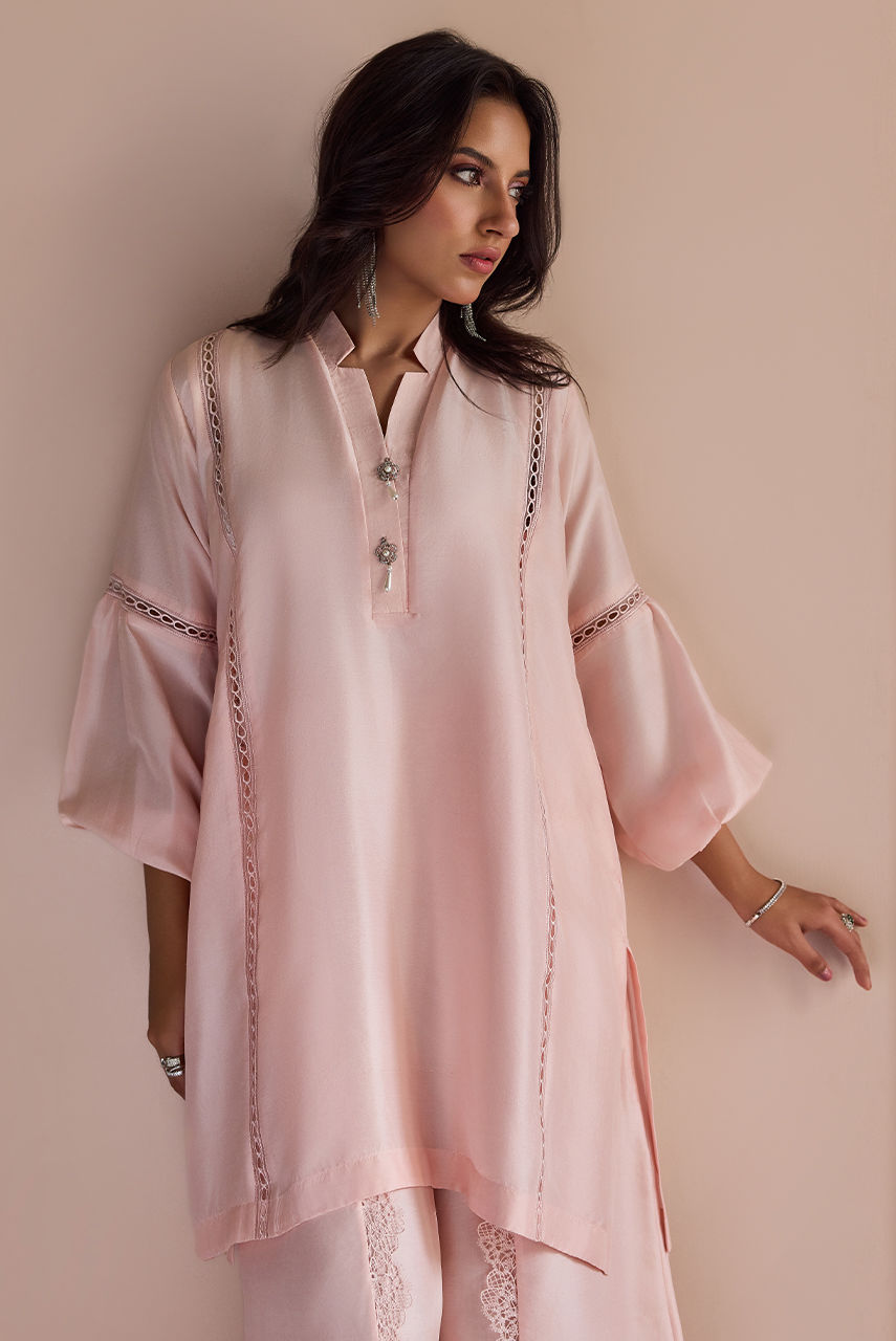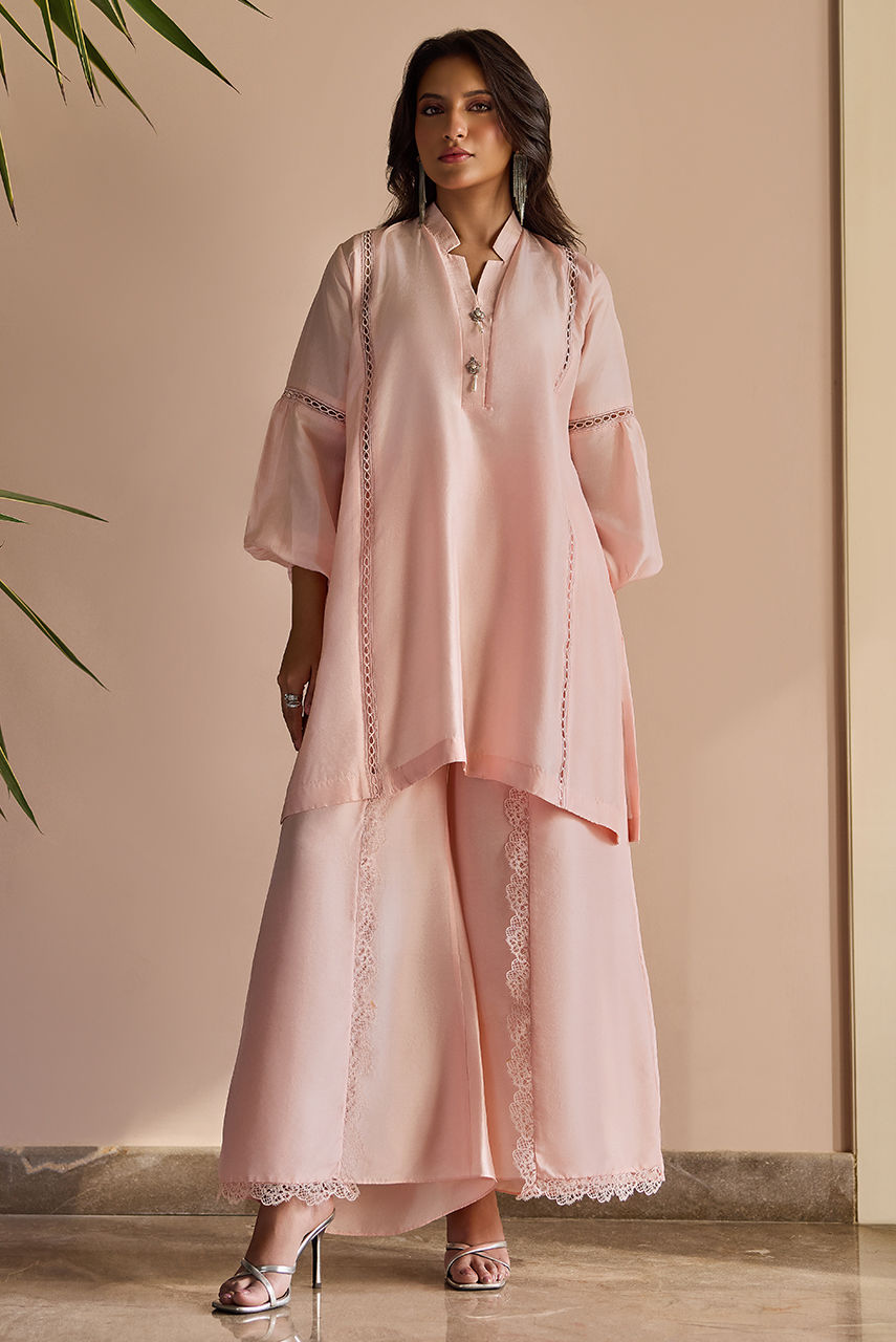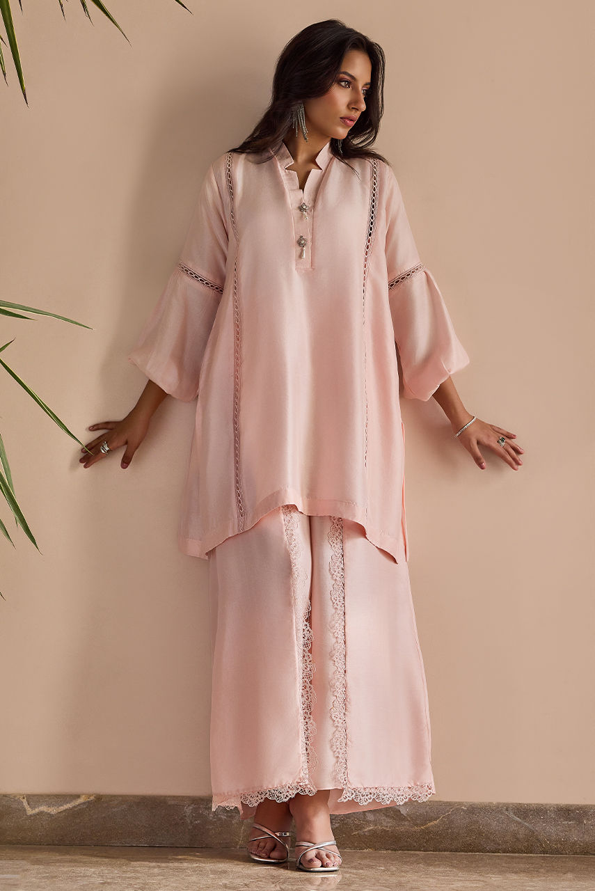 Pure raw silk ensemble is adorned with delicate lace detailing and styled with wrap-around pants, blending elegance with a contemporary edge.