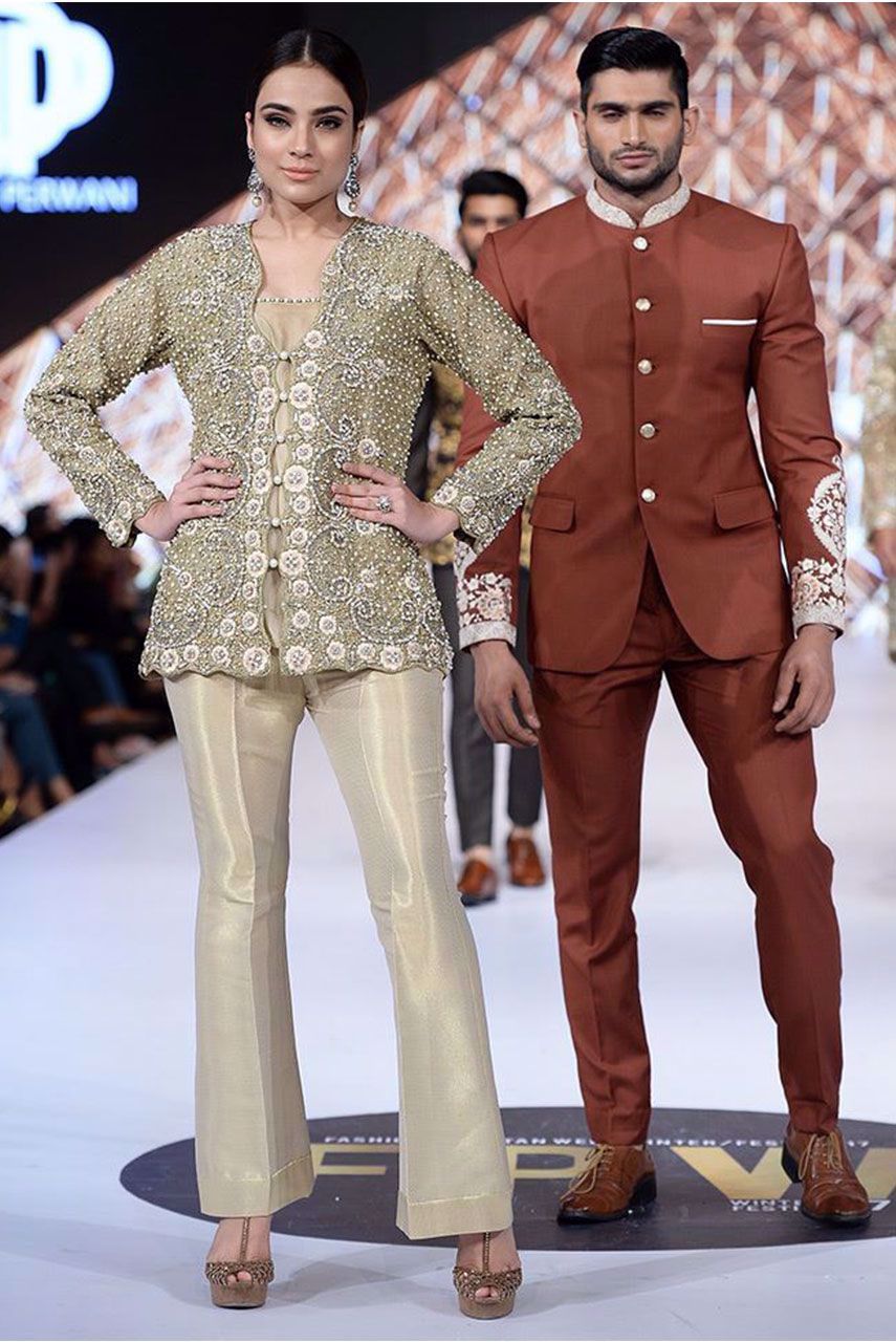 Gold zari net jacket with heavy zardozi and pearl hand work paired with gold jamawar pants.