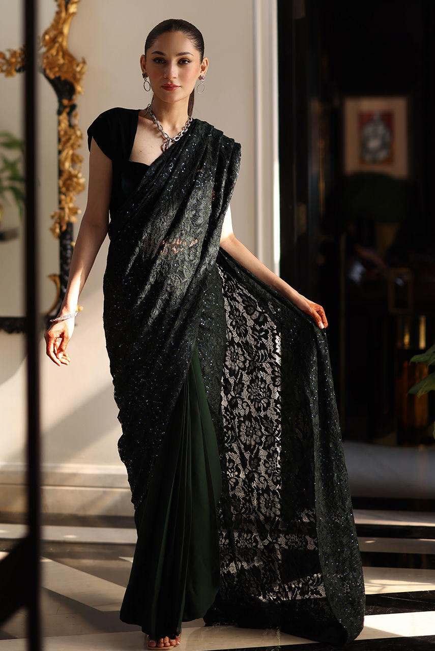 Our modern take on the sari, here we've combined chiffon and sparkle lace to make a statement yet timeless piece. The blouse is cut beautifully from velvet.
