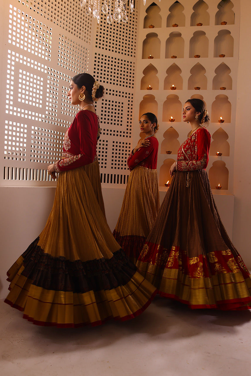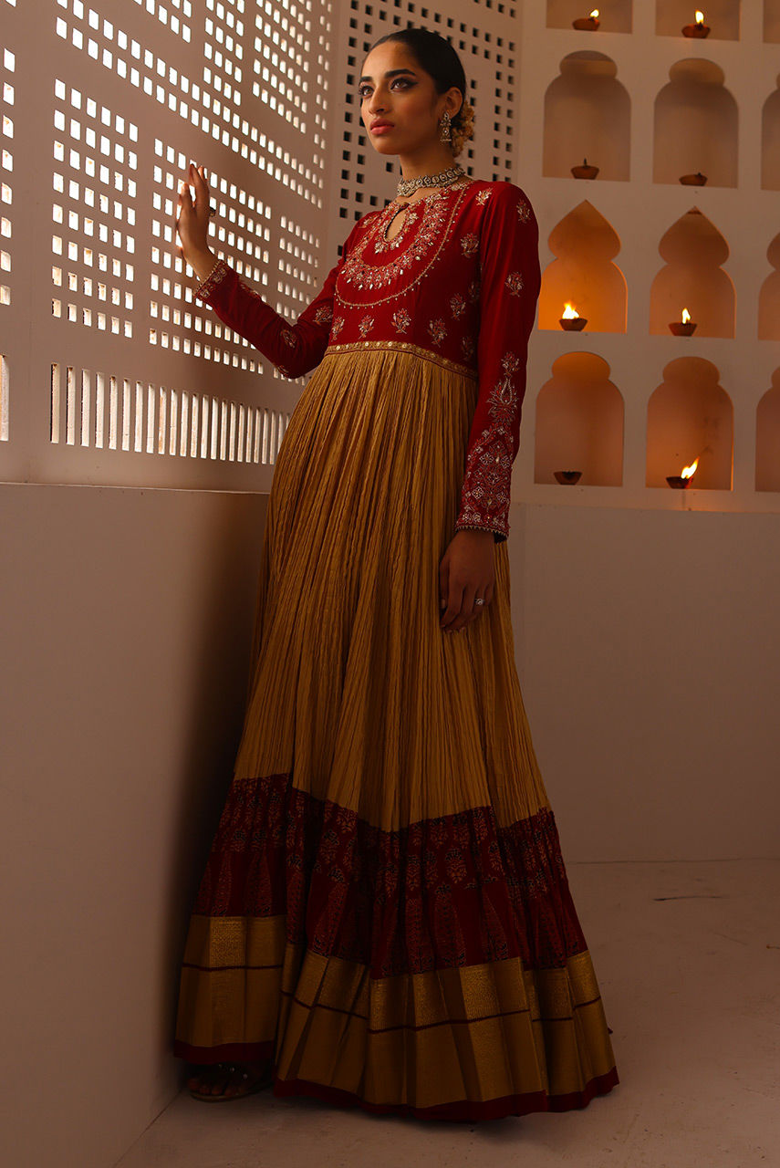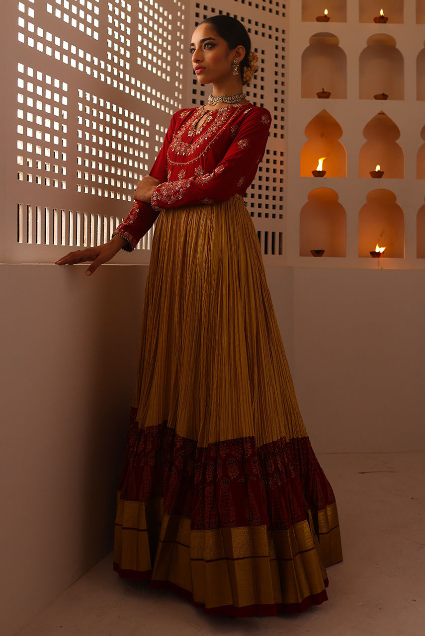 A peshwas with a beautifully composed bodice hand worked with delicate tilla, Resham and zardozi. The panels are crushed to perfection and have a block print detail at the bottom. It comes with a churidar with gotta finishing.