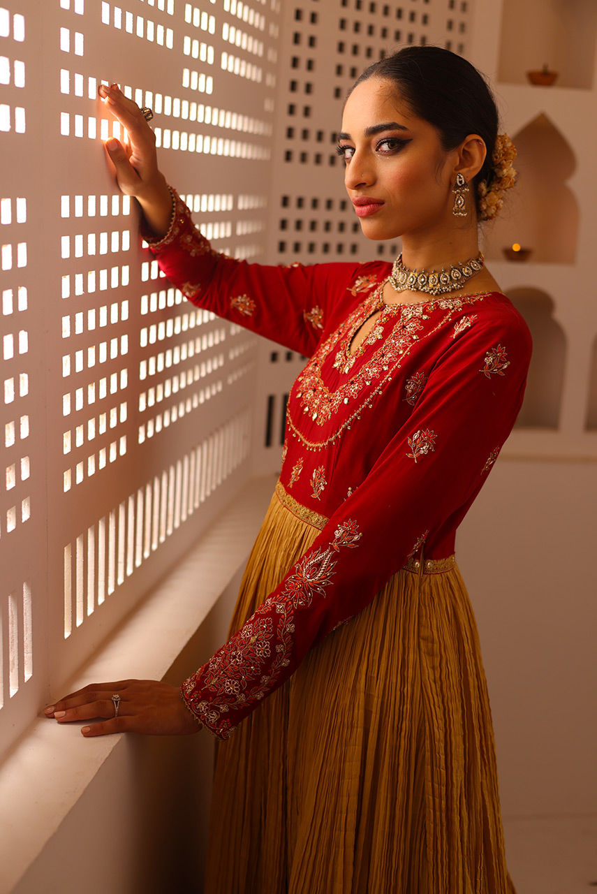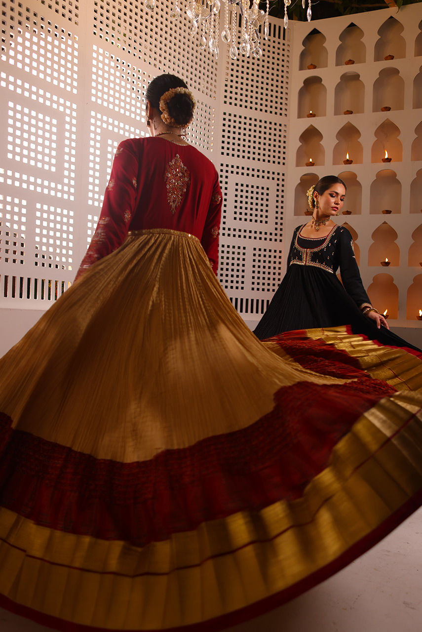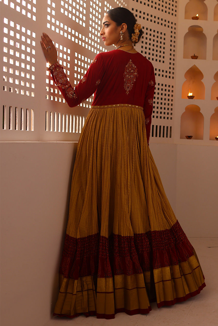 A peshwas with a beautifully composed bodice hand worked with delicate tilla, Resham and zardozi. The panels are crushed to perfection and have a block print detail at the bottom. It comes with a churidar with gotta finishing.