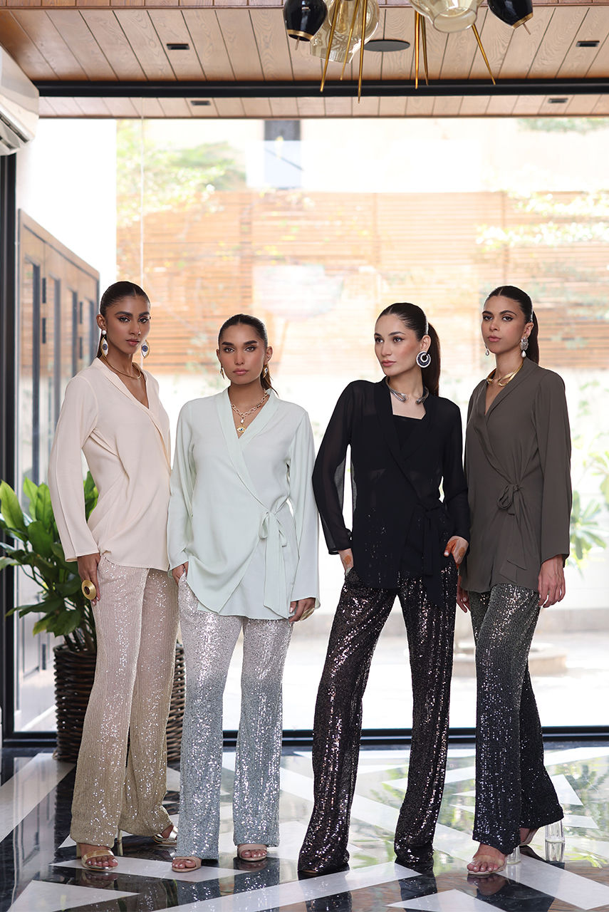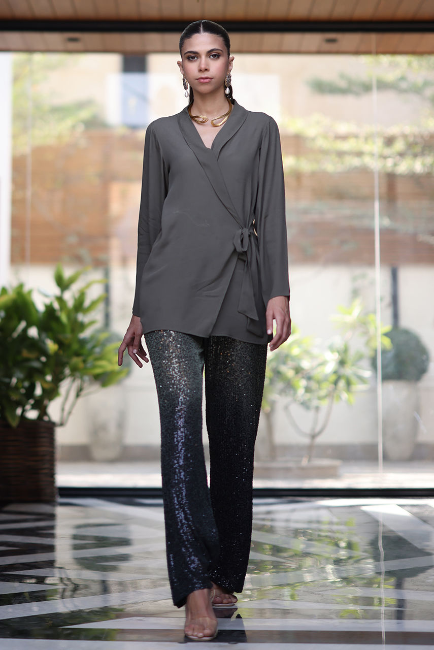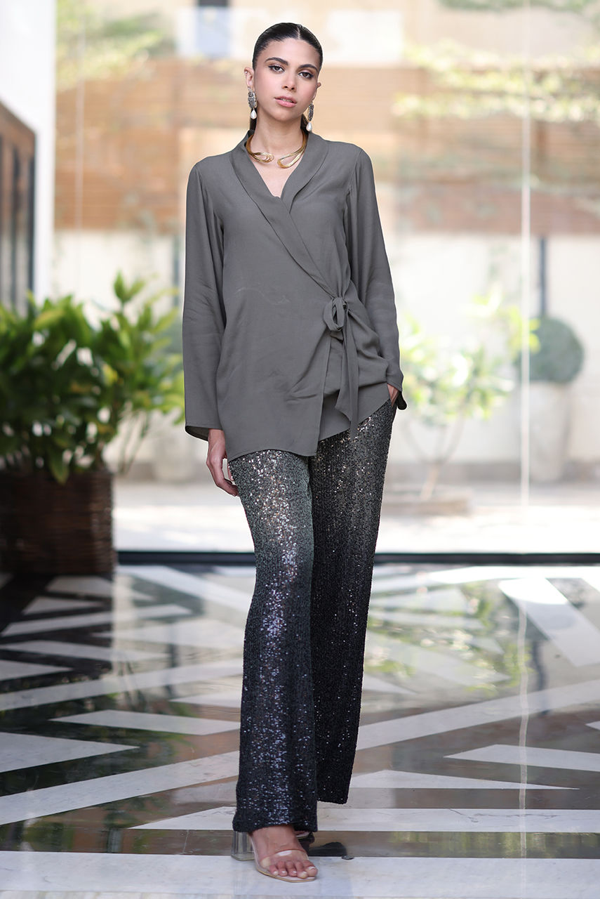 A wrap around Georgette top paired with sequin bott cut pants. The outfit exudes glamour making it a perfect choice for your next festive brunch or soirée
