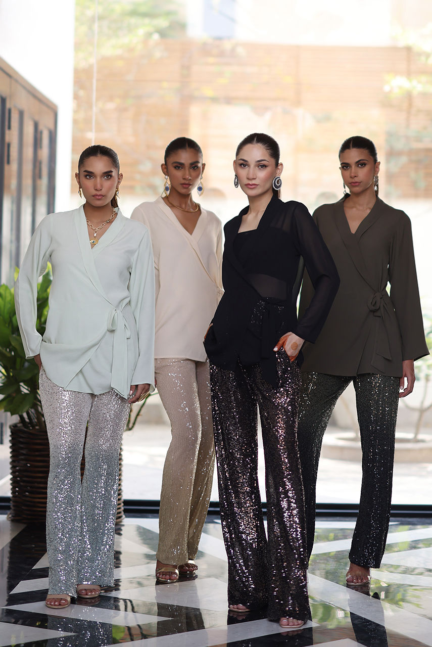 A wrap around Georgette top paired with sequin bott cut pants. The outfit exudes glamour making it a perfect choice for your next festive brunch or soirée