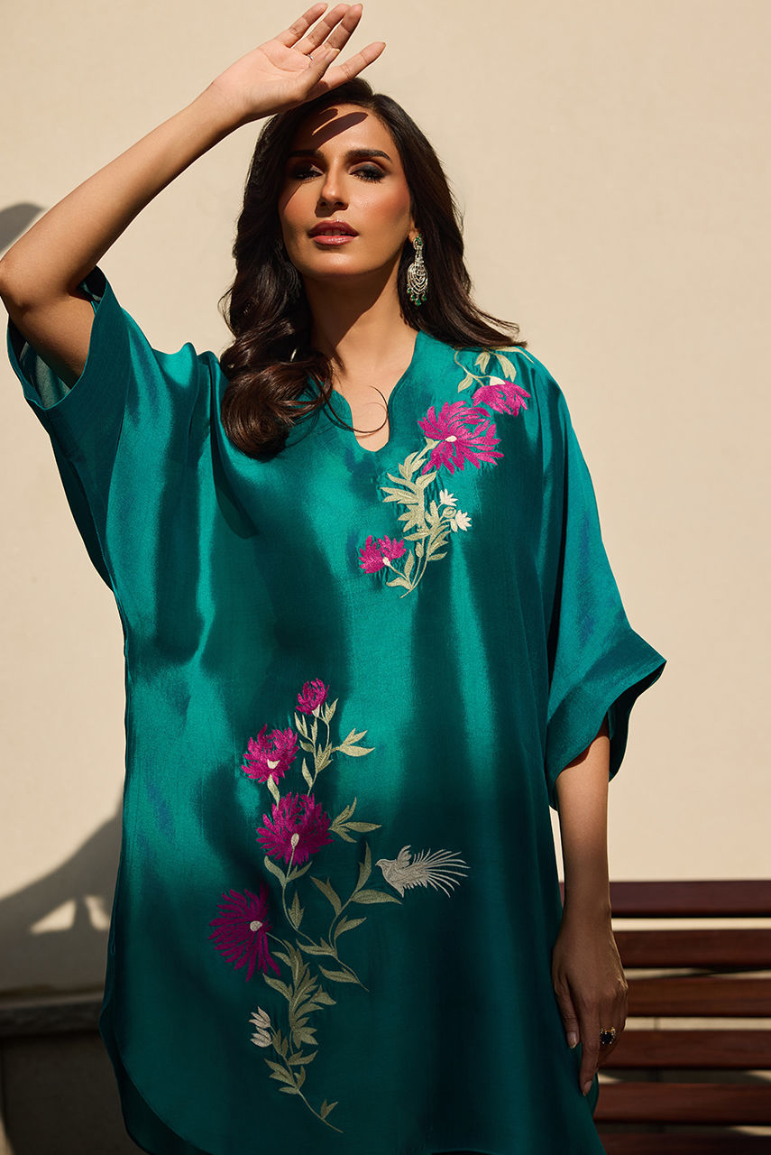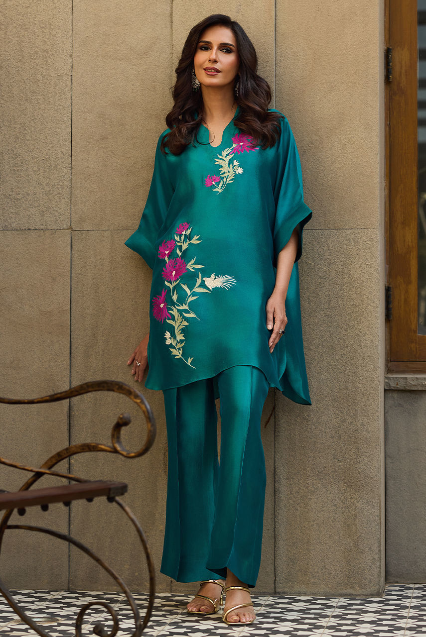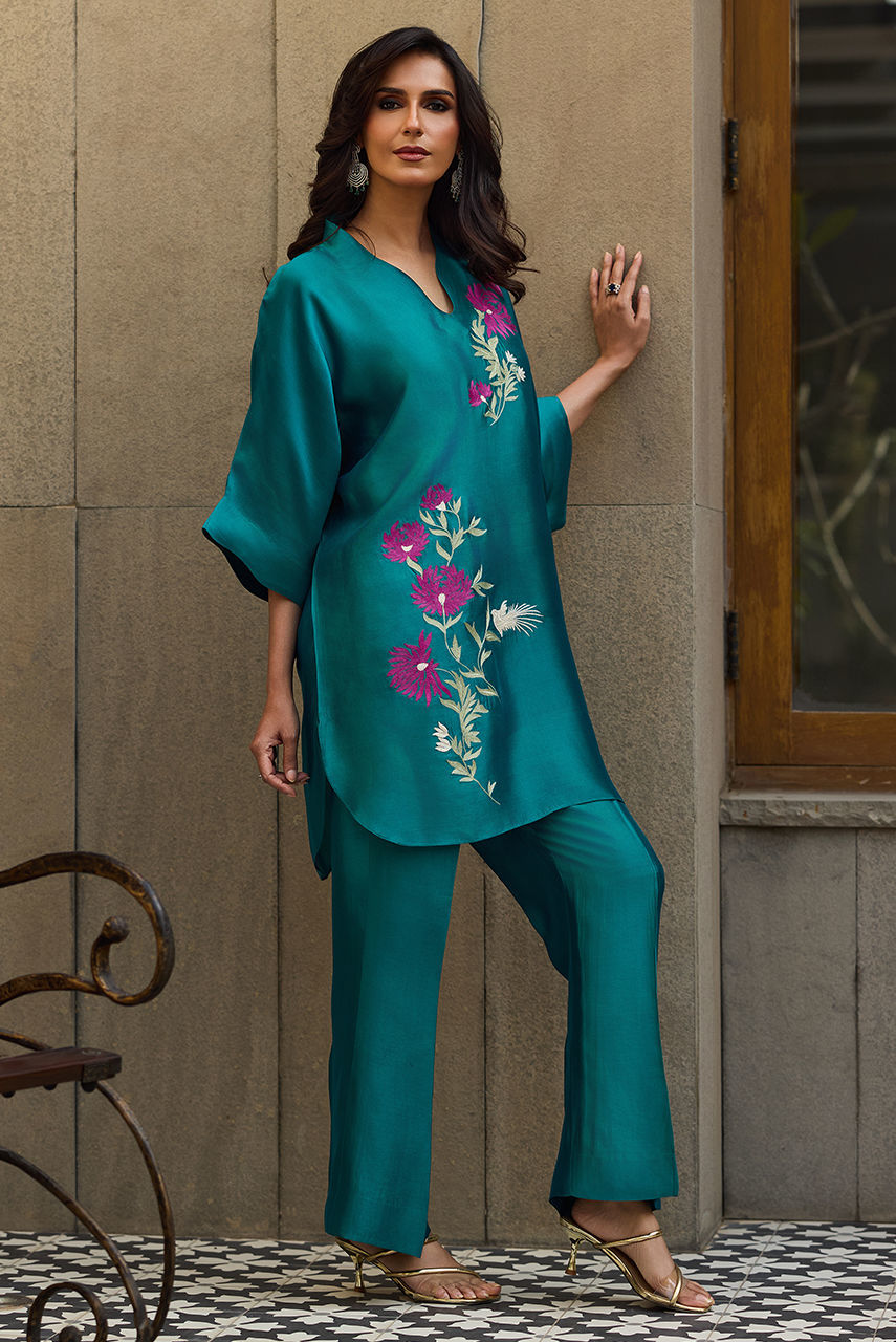 A batwing shirt with bootcut pants featuring A finely detailed thread-embroidered happy motif inspired by the delicate beauty of plum blossoms. The design blends symbolic floral elements with clean, balanced embroidery, creating a graceful and contemporary interpretation. This piece makes a perfect pret wear with a modern fusion silhouette
