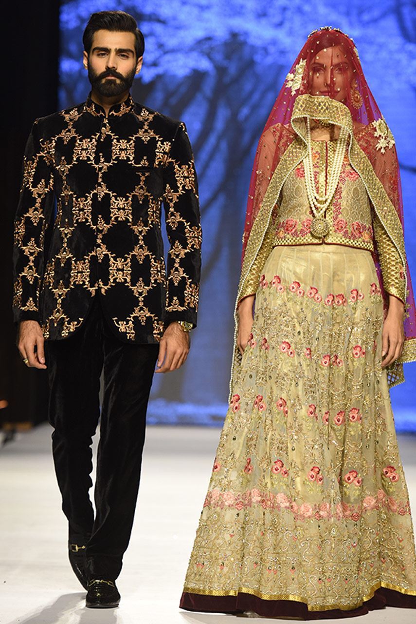 A bold black and copper fully embroidered velvet jacket paired with black velvet trousers.