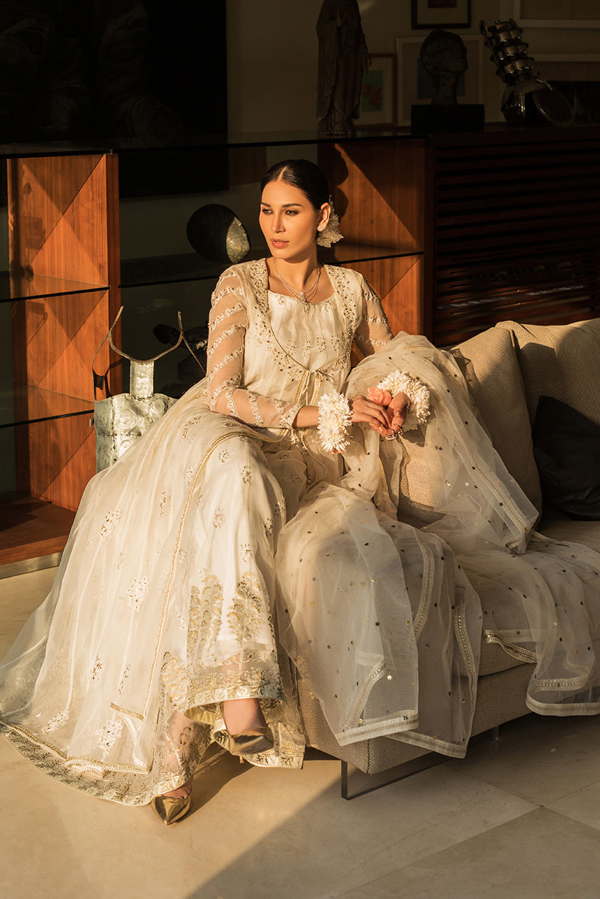 A double layered organza anarkali cut to perfection. The inner layer is hand block printed and the top layer is hand embroidered in resham zardozi and mirror work. It comes with a beautiful kamdani net dupatta and lamè trouser.